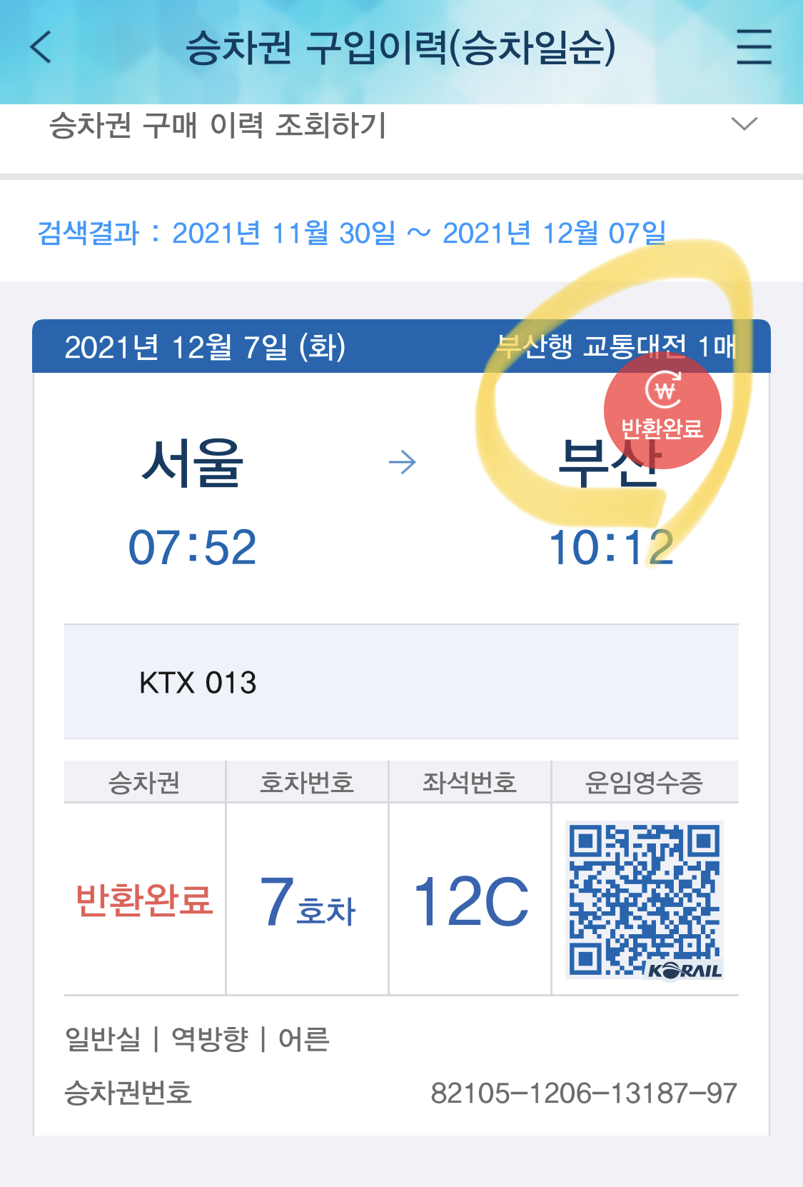창구 직원 분이 승차권 반환처리와 함께 영수증을 주십니다. 반환완료가 되면 결제처에서 50% 결제 취소 알림이 오게 되고 끝!