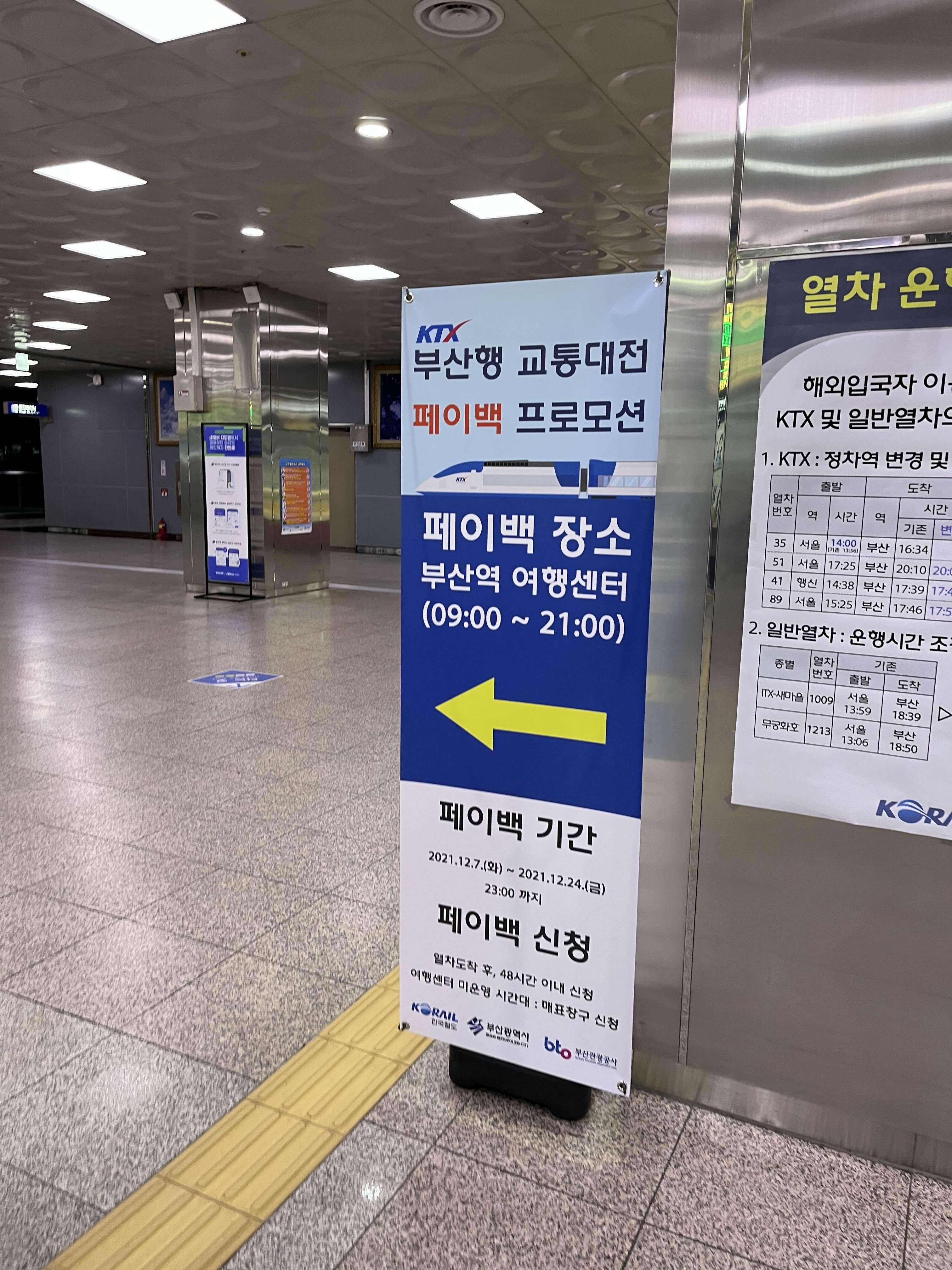 안내표를 보고 레츠코레일 여행센터 창구로 가서 직원에게 부산행 교통대전 페이백 문의를 합니다.