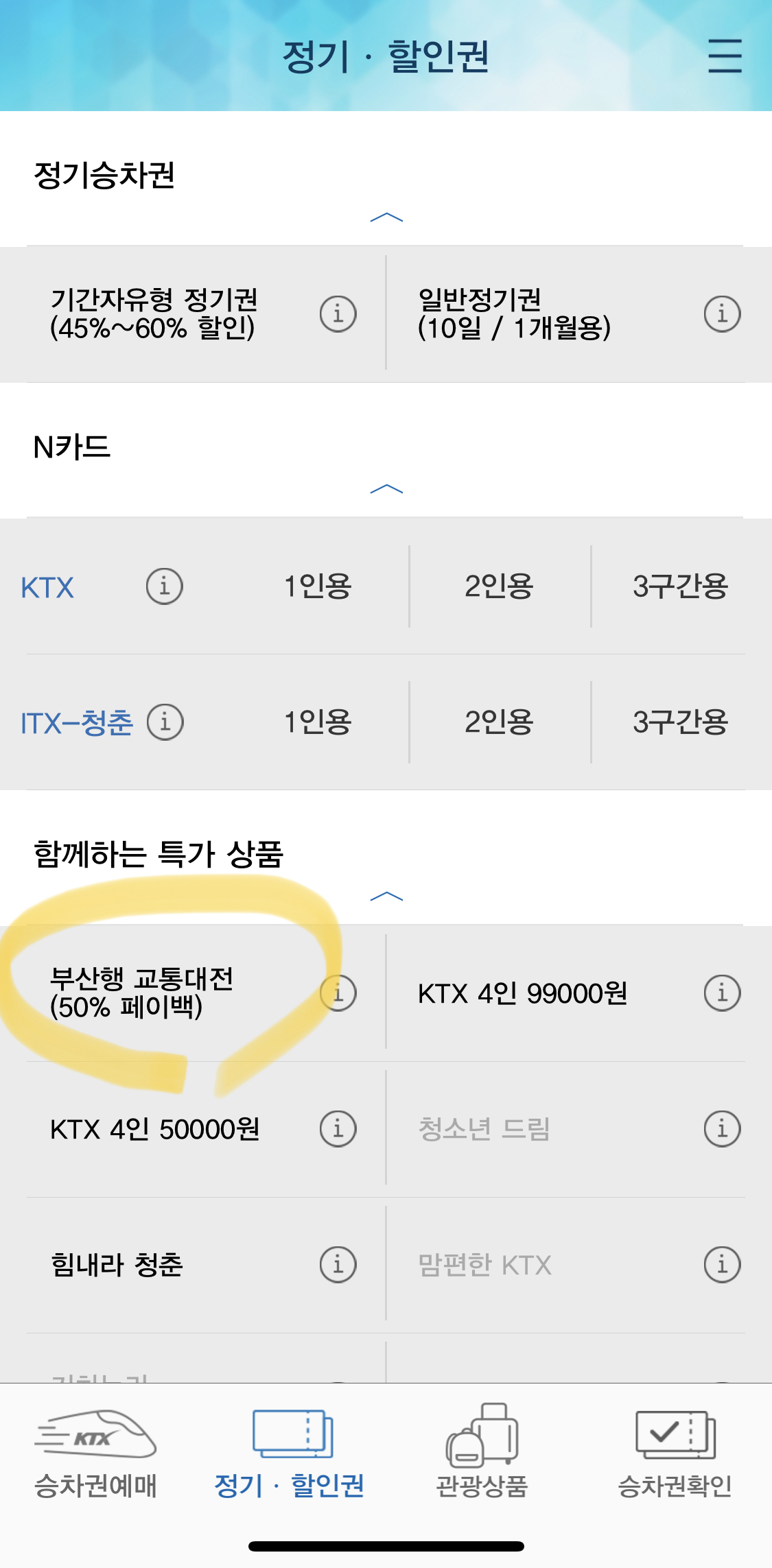 2. 앱 하단 ‘정기•할인권’ 에 들어가 함께하는 특가상품-부산행 교통대전 클릭